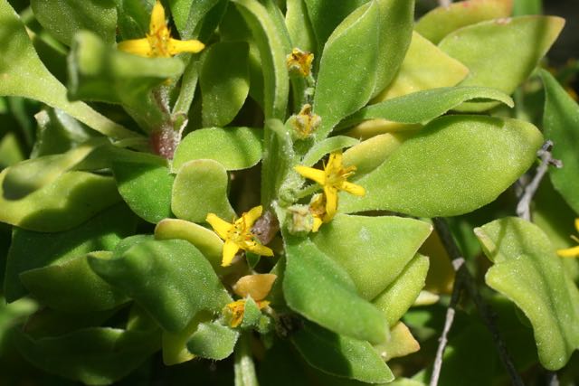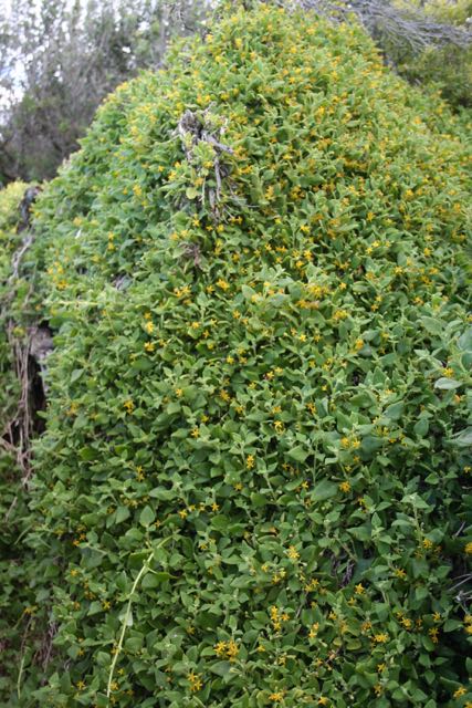 Semi-succulent leaves are bright green and loosely rhombic in shape with the underside of leaves slightly paler in colour. Strongly scented small, yellow flowers are produced in the axils of the leaves from late winter when it peaks in flowering but continuing on sporadically through to mid summer. A succulent red berry is produced over the summer months.